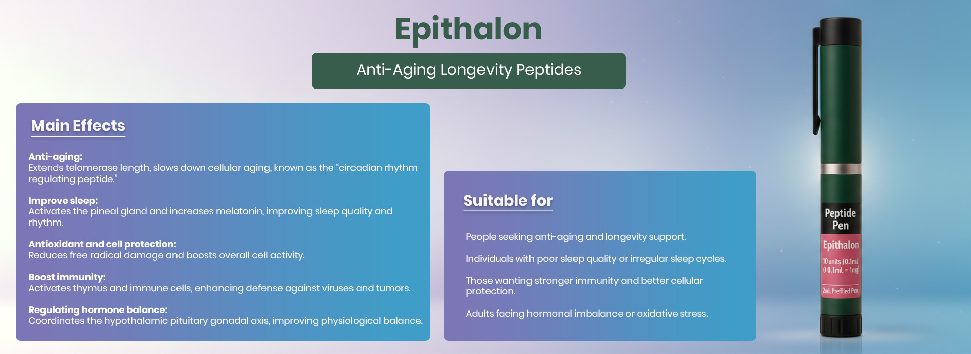 In addition, Epithalon reduces oxidative stress, enhances immune defense, and may protect against age-related conditions such as cardiovascular issues and cognitive decline.