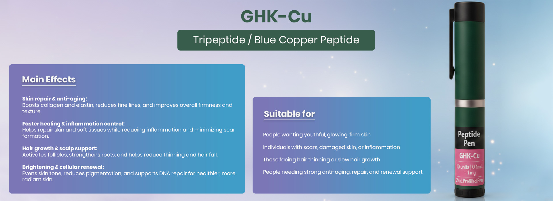 This peptide binds with copper ions, activating healing processes that help repair damaged tissue, stimulate collagen production, and improve overall skin texture.