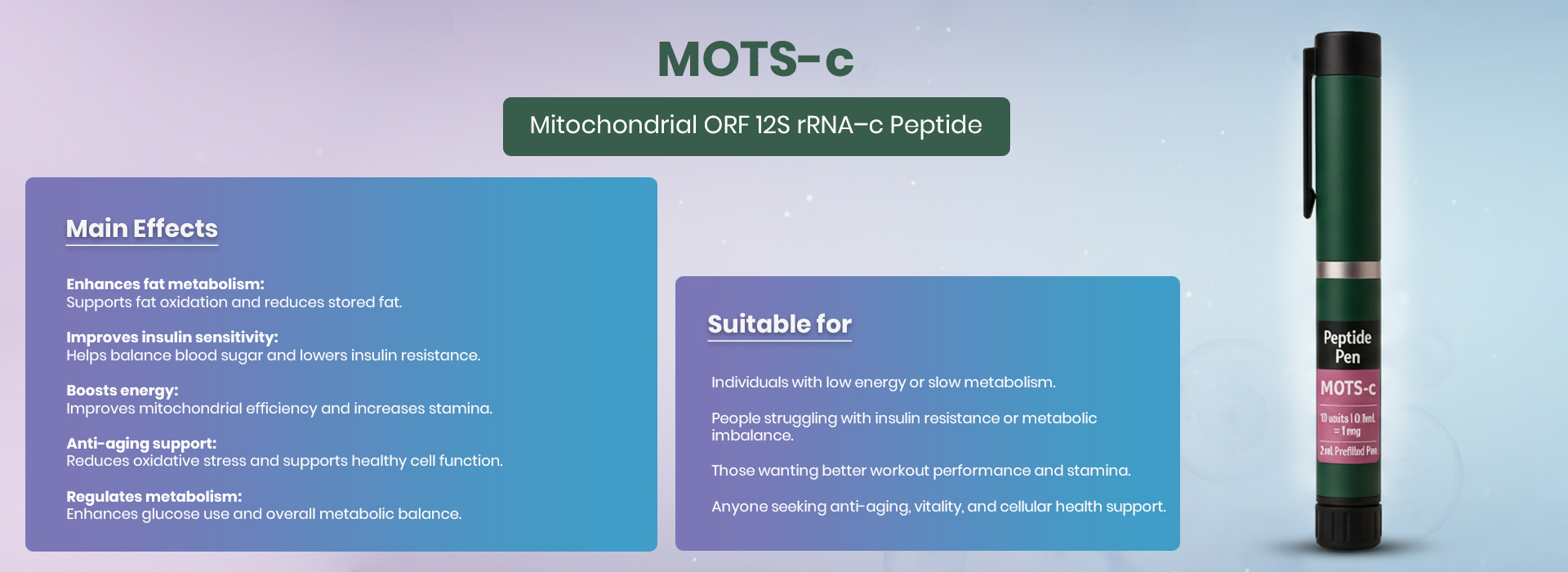 MOTS-c helps the body convert glucose and fat into energy more efficiently, improving mitochondrial performance and promoting better metabolic health.