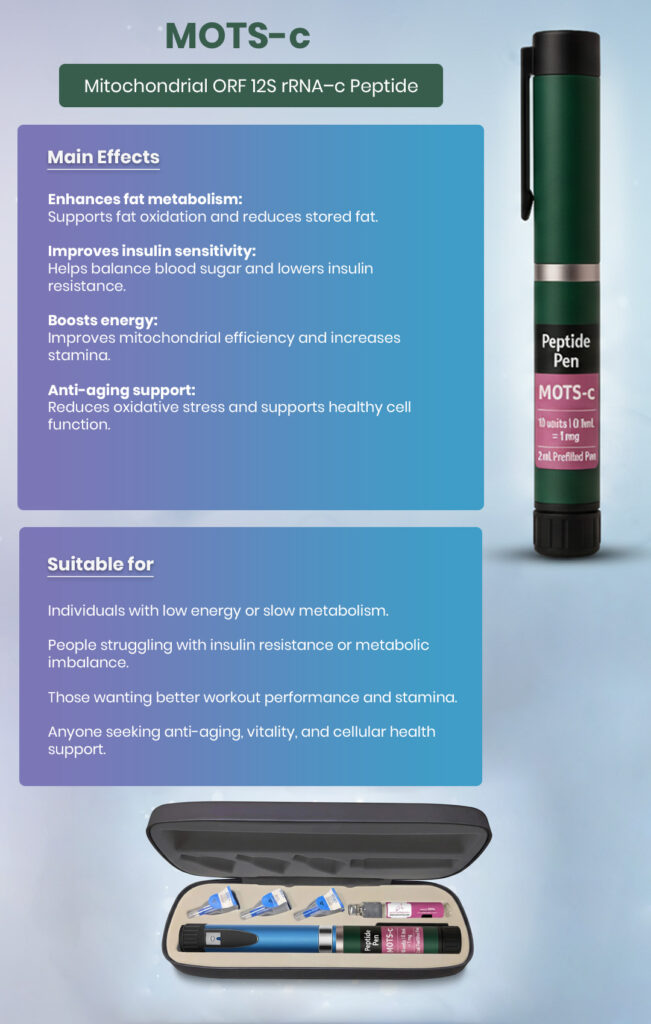 MOTS-c (Mitochondrial Open Reading Frame of the 12S rRNA type-c) is a mitochondria-derived peptide that plays a crucial role in maintaining metabolic balance, energy regulation, and overall cellular health. It is naturally produced within the body’s mitochondria, the “powerhouses” of cells, and acts as a messenger that regulates how the body uses energy.