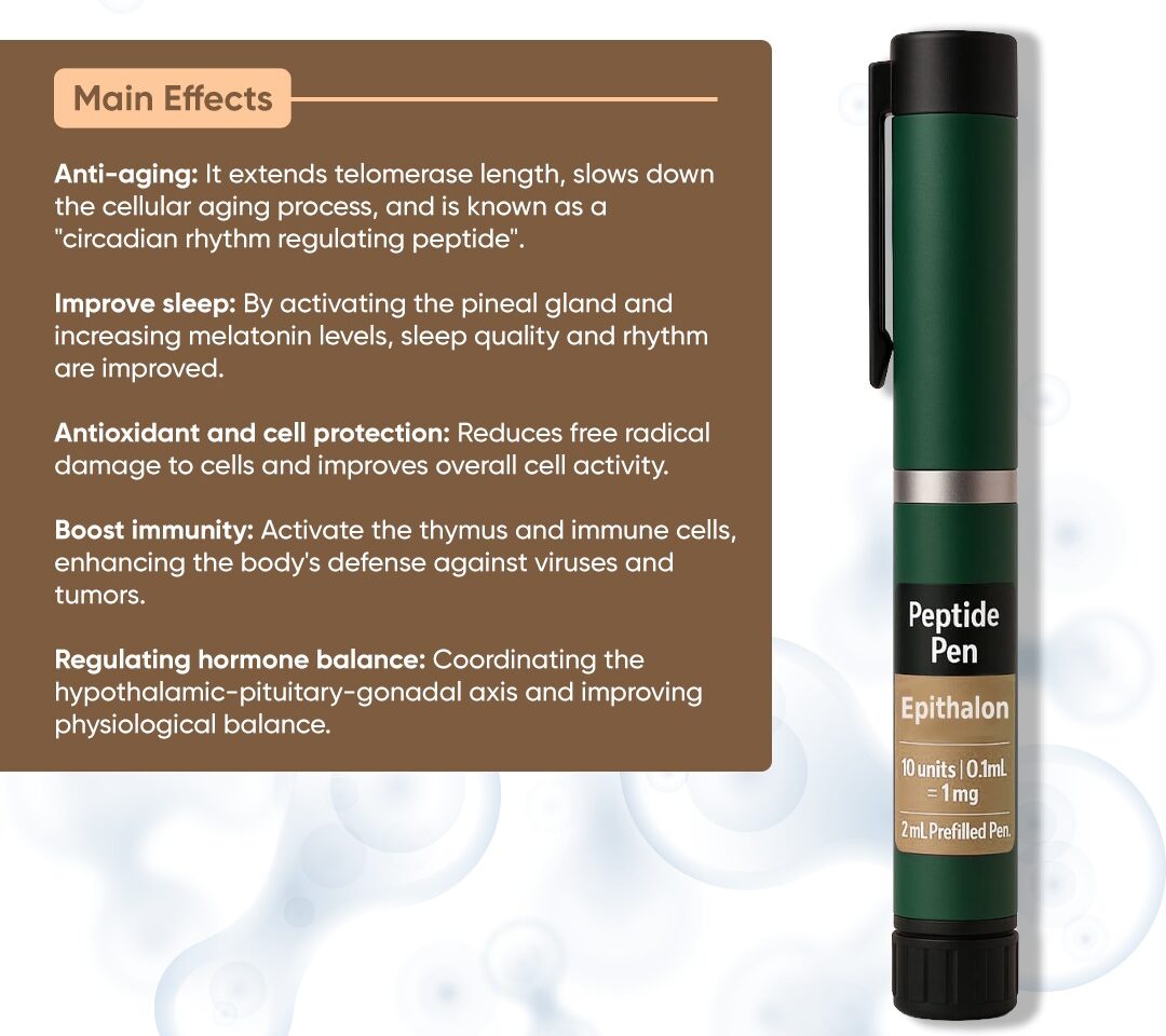 In addition, Epithalon reduces oxidative stress, enhances immune defense, and may protect against age-related conditions such as cardiovascular issues and cognitive decline.