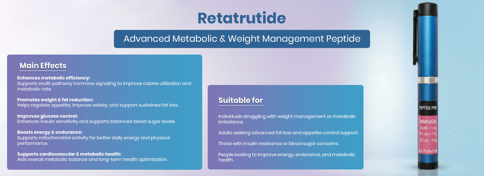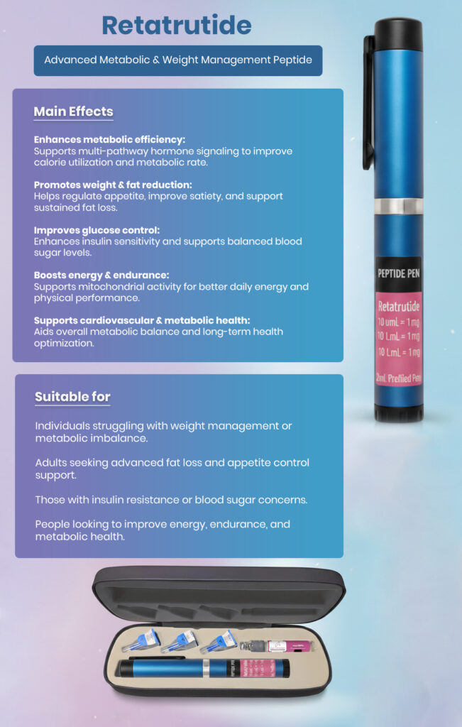 Retatrutide is a next-generation injectable peptide designed to support weight loss, fat reduction, metabolic balance, and insulin sensitivity. It works by activating three key hormone pathways in the body (GLP-1, GIP, and glucagon), helping regulate appetite, energy use, and fat metabolism more effectively than single-pathway treatments.