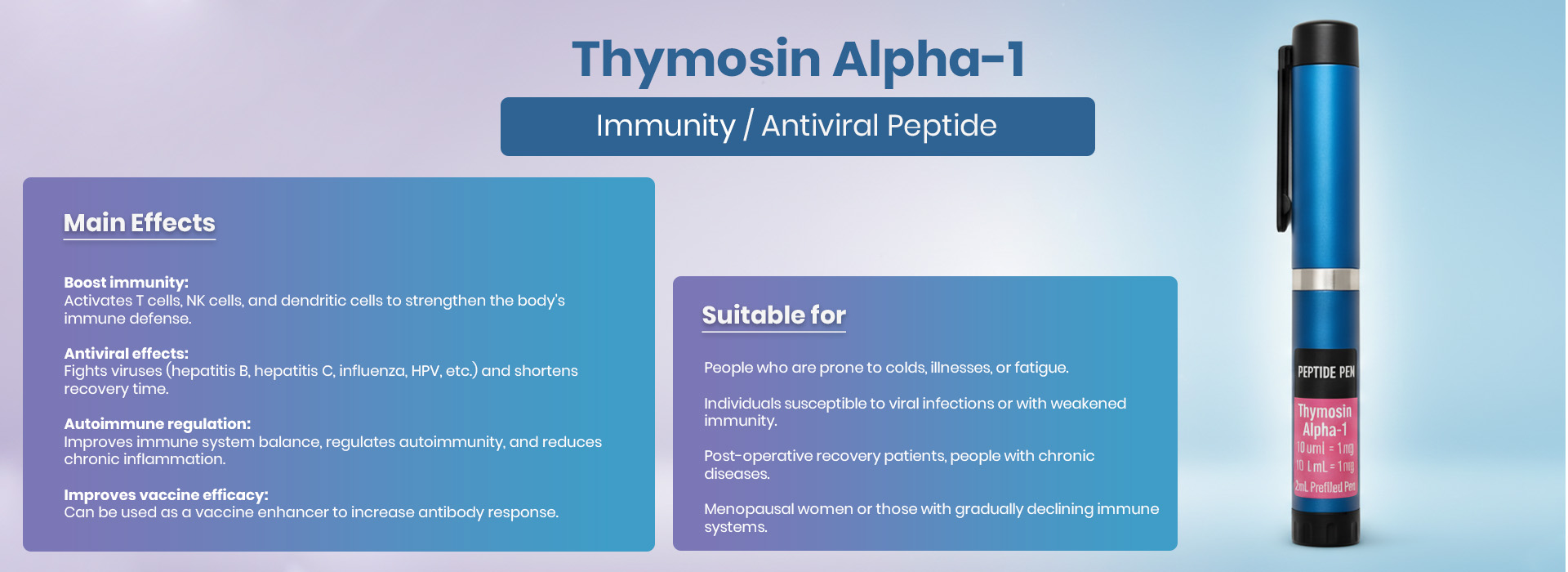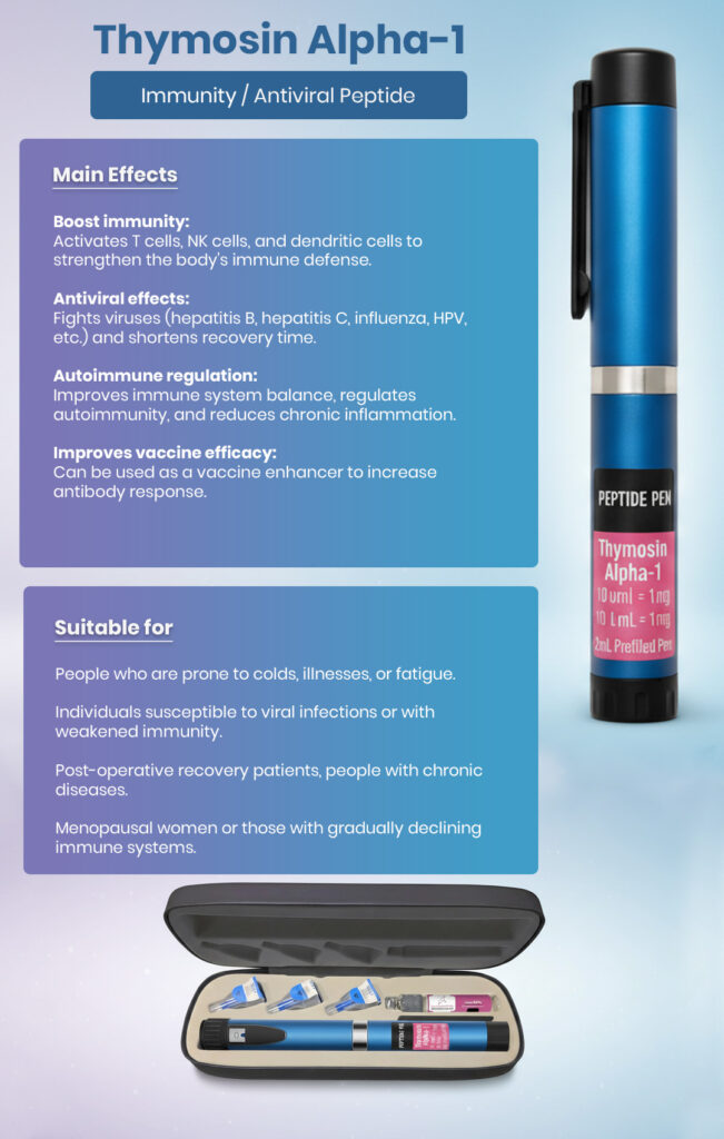 Often prescribed to support immune strength, Thymosin Alpha-1 helps the body prevent infections like the flu or common cold while promoting recovery from fatigue and immune stress.