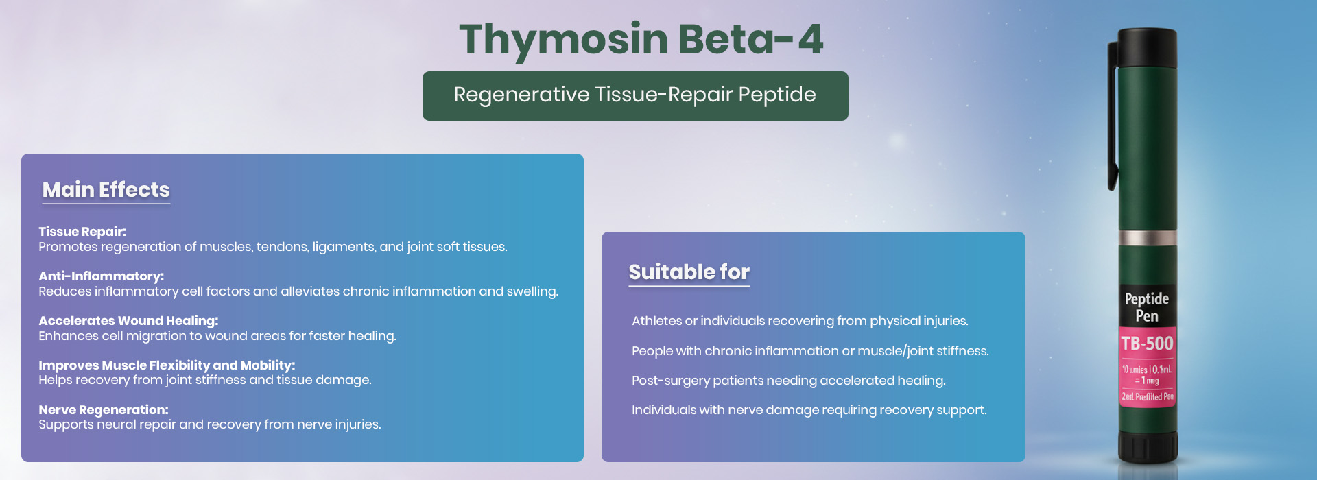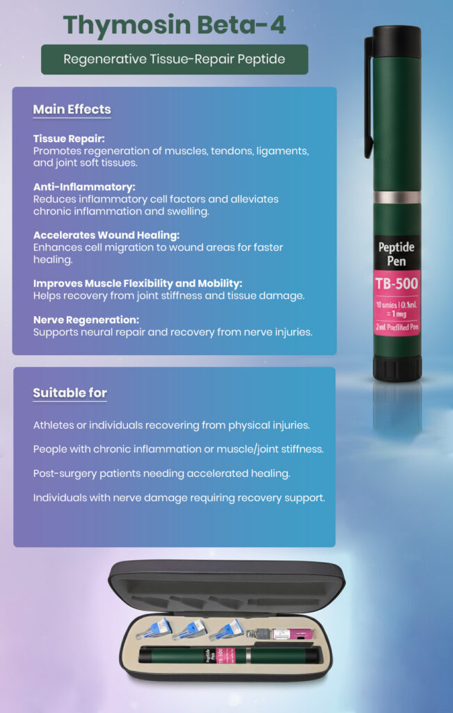 Thymosin Beta-4 is well-tolerated and safe for most individuals. The only reported effects are mild irritation or redness at the injection site. It can be used short-term for acute recovery or long-term to support active tissue healing and overall mobility.